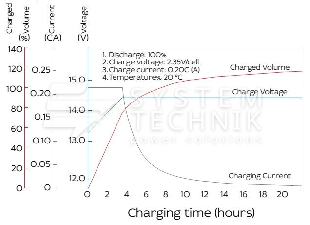 - Рекомендуемое напряжение заряда в циклическом режиме для 12В батареи: 13,5В-14,1В при 25ºС;